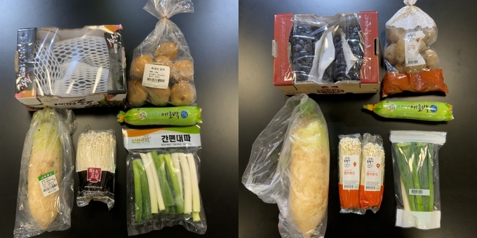 먼저 각 배달 애플리케이션에서 된장찌개 재료와 후식용 과일을 선별해 동시 주문했다. 팽이버섯(300~360g)과 애호박, 감자 1.2㎏, 대파, 햇무, 캠벨 포도 1㎏ 등 모두 6종인데, 애호박만 동일한 상품이다. 다른 재료는 유사한 상품으로 대체했다.