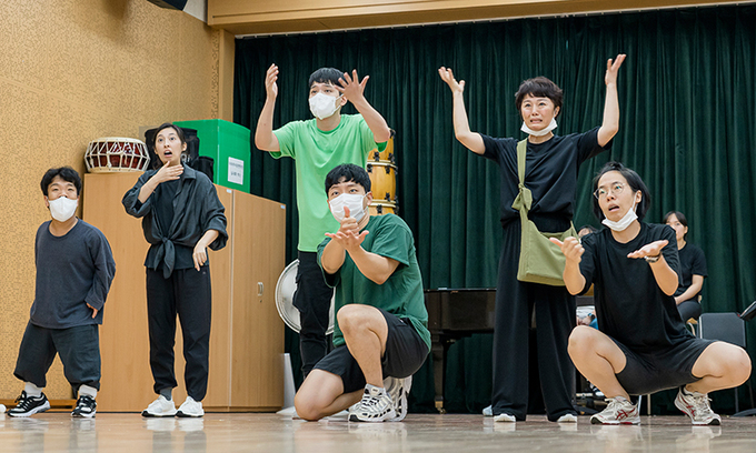 무장애 공연으로 기획된 음악극 ‘합★체’에서 각각 아빠·합·체 역을 맡은 김범진(앞줄 왼쪽)·이성민(〃가운데)·박정혁(뒷줄 가운데) 배우가 각자의 ‘그림자 통역’을 맡은 정은혜(뒷줄 왼쪽)·성지윤(앞줄 오른쪽)·송윤(뒷줄 오른쪽) 배우와 연습 중인 모습. 그림자 통역 배우들이 담당 배우 동작을 따라하거나 수화로 통역하고 있다. 국립극장 제공