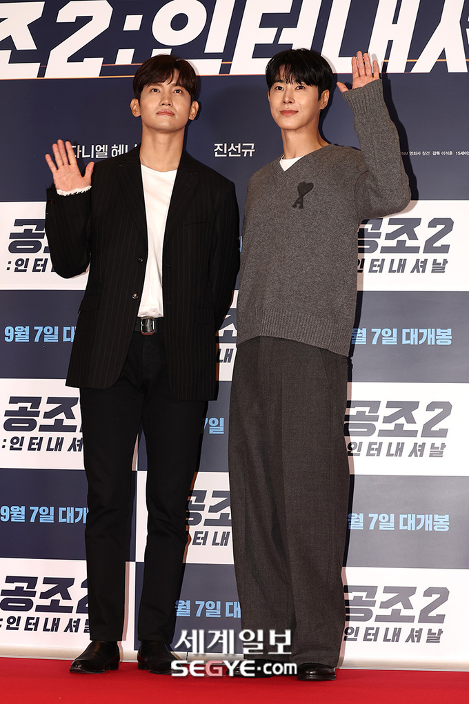 가수 최강창민(사진 왼쪽)과 유노윤호가 6일 오후 서울 용산 CGV에서 열린 영화 ’공조2: 인터내셔날’의 VIP 시사회에 참석해 포즈를 취하고 있다.