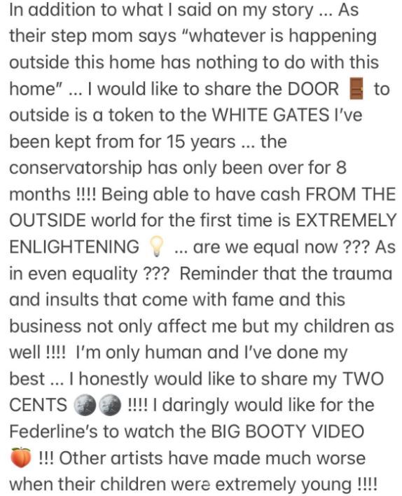 이러한 인터뷰가 공개되자 브리트니 스피어스는 지난 9월2일(한국시간) 자신의 인스타그램을 통해 “나는 아들 제이든에게 내 남은 인생 동안 할 수 있는 사랑을 보낸다고 말하고 싶다”라며 “아이들에 대한 내 사랑은 한계가 없다”고 심경을 전했다.