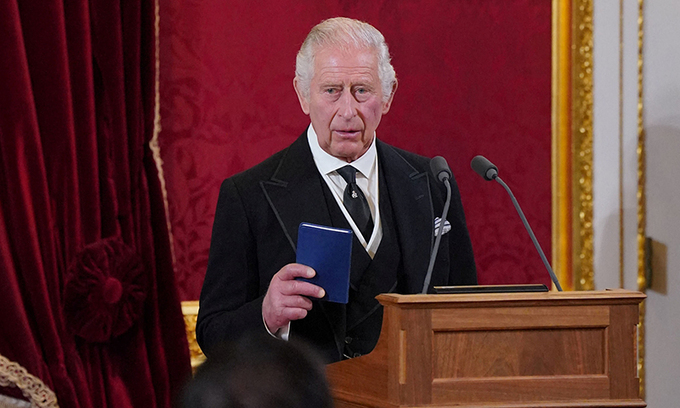 이날 런던 세인트 제임스 궁전에서 열린 즉위식에서 영국 즉위위원회는 "찰스 필립 아서 조지 왕세자가 찰스 3세 국왕이 됐다"고 선언했다. 찰스 왕세자는 어머니 엘리자베스 2세 여왕이 8일 서거하자 자동으로 왕위를 승계받지만, 즉위식은 새 군주를 국가에 소개하는 데 있어 헌법적이고 의례적인 중요한 단계이다.