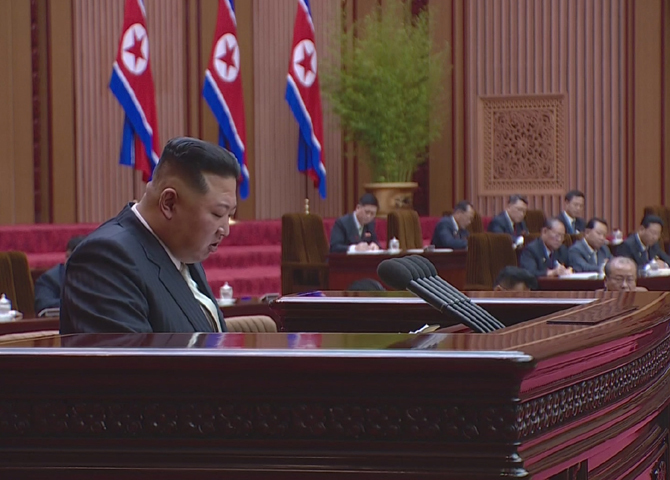 김 위원장은 8일 최고인민회의 시정연설에서 “미국이 노리는 목적은 우리의 핵 그 자체를 제거해버리자는데도 있지만 궁극적으로는 핵을 내려놓게 하고 자위권행사력까지 포기 또는 렬세하게 만들어 우리 정권을 어느 때든 붕괴시켜버리자는 것”이라고 밝혔다. 김 위원장은 “나라의 생존권과 국가와 인민의 미래의 안전이 달린 자위권을 포기할 우리가 아니며 그 어떤 극난한 환경에 처한다 해도 미국이 조성해놓은 조선반도의 정치군사적 형세하에서, 더욱이 핵적수국인 미국을 전망적으로 견제해야 할 우리로서는 절대로 핵을 포기할 수 없다”고 강조했다.