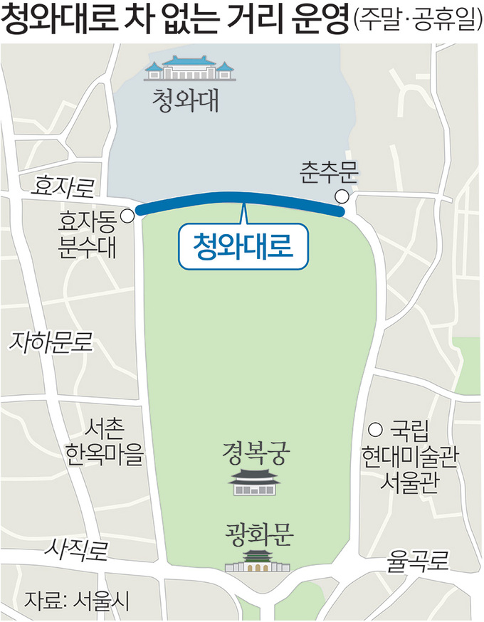 서울시가 청와대 개방에 따른 보행자 편의를 높이고자 종로구 효자동분수대(영빈문)부터 춘추문까지 이어지는 청와대로를 차 없는 거리로 운영한다.