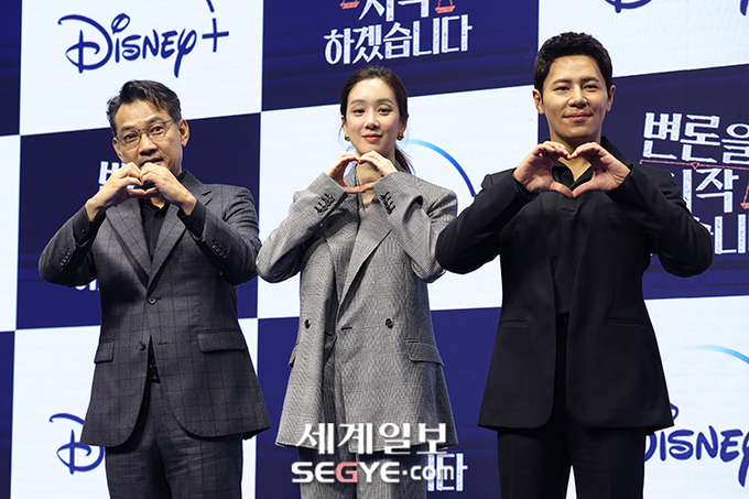 배우 정진영, 정려원, 이규형(사진 왼쪽부터)이 21일 오전 서울 중구 소공동 웨스틴조선호텔 서울에서 열린 디즈니+ 오리지널 시리즈 '변론을 시작하겠습니다'의 제작발표회에 참석해 포즈를 취하고 있다.