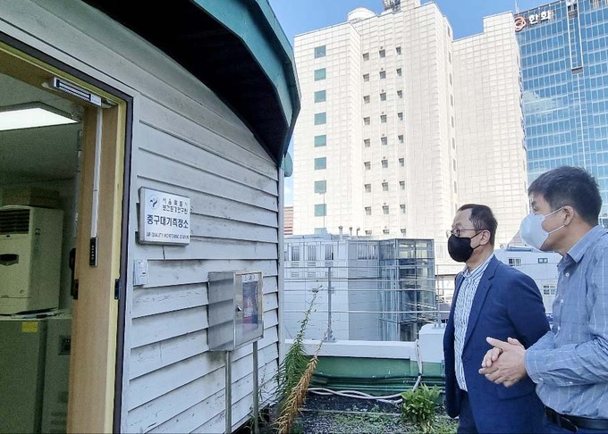 조성준 수도권대기환경청장 직무대리는 21일 서울시 중구 서소문청사를 방문하여 유해대기측정망이 설치될 서울시 중구 서울시청 서소문청사의 주변 환경을 점검하고 있다. 수도권대기환경청 제공