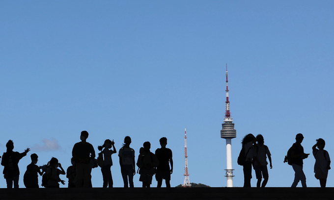 22일 서울 용산구 국립중앙박물관을 찾은 시민들과 학생들이 중앙광장 계단에 올라 푸른 하늘을 만끽하고 있다.