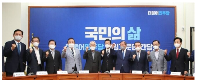 이재명 더불어민주당 대표(사진 왼쪽에서 여섯번째)는 22일 취임 후 처음으로 당 원로들을 만나 정국 운영과 관련한 조언을 들었다.