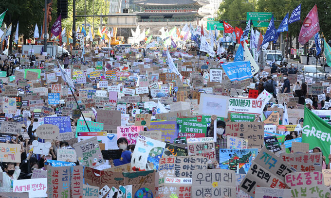 기후위기 심각성을 알리고 기후정의 실현을 촉구하는 시민 3만5000명이 24일 서울 도심에 모였다. 지금까지 국내에서 벌어진 기후운동 가운데 최대 인원이다. 참가자들은 여전히 더딘 한국사회의 기후위기 대응을 비판하며 더 적극적인 온실가스 감축과 취약계층 보호를 촉구했다. 시민들의 목소리에 국회와 정부가 응답할지 관심이 모인다.
