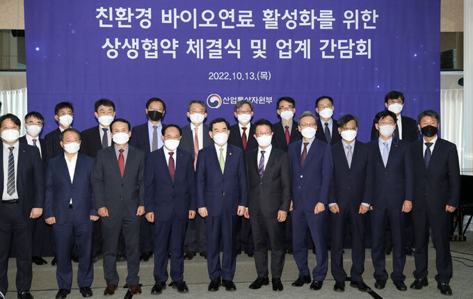 산업통상자원부는 13일 서울 중구 한국프레스센터에서 친환경 바이오연료 활성화를 위한 업계 간담회를 열고 논의 내용을 발표했다. 간담회에는 이창양 산업부 장관과 산업부·국토교통부·해양수산부 담당 국장, 차동형 한국석유관리원 이사장, 김종남 한국에너지기술연구원장, 권기영 한국에너지기술평가원장, 주영민 현대오일뱅크 대표, 임대재 이맥솔루션 대표 등 주무부처와 업계 인사가 대거 참석했다.