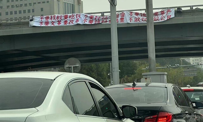 13일 자유아시아방송과 트위터 등에 따르면 이날 오전 베이징 톈안먼 광장에서 북서쪽으로 약 9㎞가량 떨어진 북 3순환 고가도로 쓰퉁교(四通橋)에 붉은색 글씨가 쓰인 두 장의 현수막이 내걸렸다.