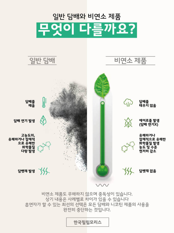 최선의 선택은 금연이다. 그렇지만 흡연을 지속하고자 하는 성인 흡연자에게는 유해물질 배출이 현저히 감소된 비연소 제품이 공중 보건 차원에서 더 나은 대안이 될 수 있다. 비연소 제품은 일반 담배와 달리 담배를 태우지 않기에 다양한 유해 물질이 포함된 담배 연기를 발생시키지 않는다.