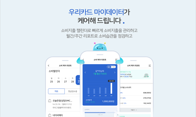 우리카드는 생활밀착형 ‘마이데이터’ 서비스도 제공하고 있다. 데이터 연결 방식을 ‘Open API’로 도입해 보다 편리하고 안정적인 자산 연동을 제공하며, 기본적인 자산·소비 현황뿐만 아니라 고객의 금융 생활 및 안정적인 자산 운용을 위한 서비스도 포함해 제공 중이다. 간편결제, 쇼핑몰 포인트 등 전체 업권의 포인트를 관리해주는 ‘전 업권 포인트 통합 관리 서비스’와 카드 결제액, 보험료 등 고정지출을 알려주는 ‘금융 캘린더 서비스’, ‘유사 고객군 내 지출 개선 필요영역 안내’ 등도 제공한다.