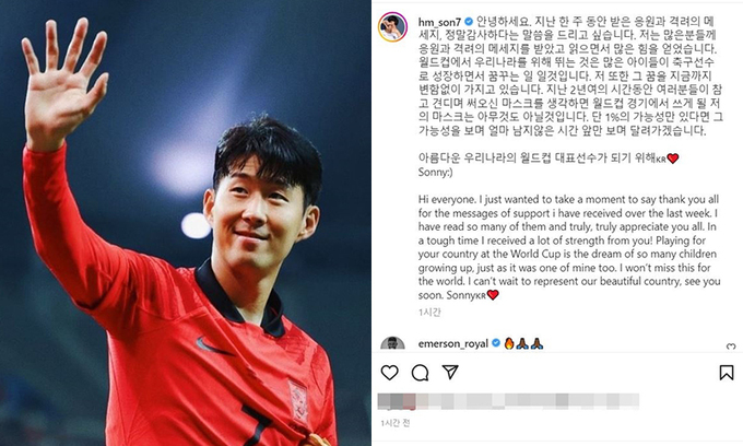 마스크를 쓰고서라도 월드컵에 나서겠다는 선언이다. 손흥민이 그동안 대표팀에 보여온 열정과 책임감을 비춰볼 때 월드컵 출전을 강행할 것이라는 예상은 부상 직후부터 나왔다. 이후 출전 가능성을 조금이라도 높이기 위해 수술 일정을 당기기까지 했다. 여기에 이번에는 SNS를 통해 또 한번 반드시 월드컵을 향한 의지를 공개적으로 드러냈다.
