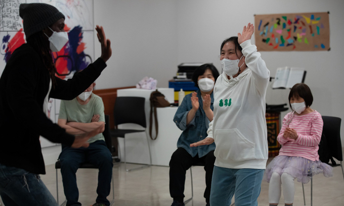 지난 8일 오후, 서울 세종문화회관에서 마주한 연극 ‘등장인물’ 연습 현장은 작품 제목처럼 여러모로 낯설고 독특했다. 주고받는 대사도 없었다. 그저 음악이 바뀔 때마다 거동이 불편한 발달장애인 배우가 차례로 나와 비장애인 조력자 도움을 받아 자신만의 춤과 몸짓을 보여줬다. 자기 차례가 아닌 배우들은 의자에 앉아 본인이 하고 싶은 대로 했다. 칠판에 뭔가를 끄적이고 유튜브 영상을 시청하거나 책상 위에 놓인 스티커를 하염없이 붙이는 등 공연에 집중하지 않아도 누구 하나 뭐라 하지 않았다. 어수선해 보이기도 한 상황에 처음엔 ‘뭐지?’ 하다 등장인물 한 명 한 명이 눈에 들어오는 순간을 맞게 된다. 보통 연극을 관람할 때 배우 자체보다 극중 캐릭터가 도드라져 보이는 것과 다른 경험이다.