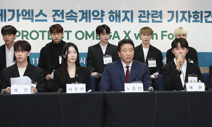 오메가 엑스는 16일 서울 서초구 변호사회관에서 기자회견을 열고 소속사 대표의 폭행 등에 대한 입장을 밝혔다.