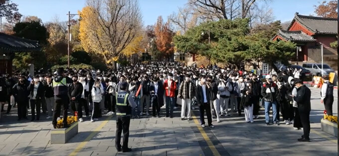 2023학년도 수시모집 논술시험이 치러진 20일 서울 종로구 성균관대학교 인문사회캠퍼스에서 학교 관계자들이 안전사고 방지를 위해 시험장을 나오는 수험생들의 이동 흐름을 조절하고 있다.