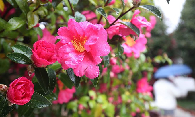 제주지역에 겨울을 재촉하는 비가 내린 20일 서귀포시 남원읍 한 카페에 동백꽃이 활짝 펴 관광객들의 눈길을 사로잡고 있다.
