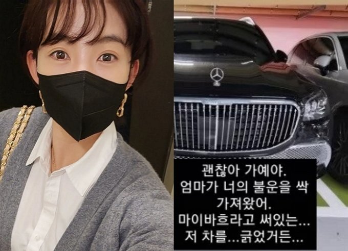 최근 설수현은 인스타그램 스토리에 “괜찮아 딸아. 엄마가 너의 불운을 싹 가져왔어. 마이바흐라고 써있는 저 차를 긁었거든”이라는 글과 함께 사진을 게재했다.