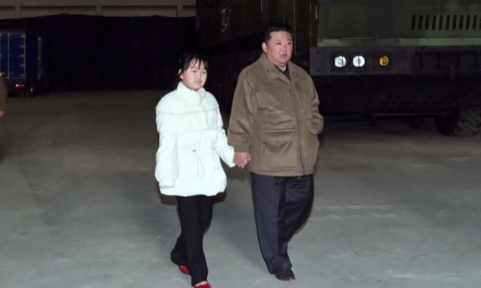 신문이 공개한 사진에는 햐얀색 점퍼에 검은색 바지를 입은 여자아이가 김 위원장의 손을 잡고 미사일 옆을 걷거나 발사를 지켜보며 박수를 치는 모습 등이 담겼다.