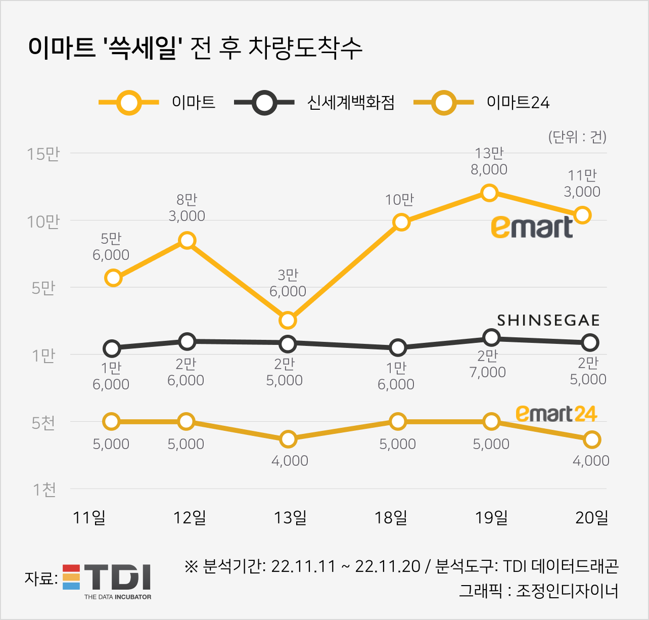 특히 이마트 총 차량도착수는 전주에 비해 20만 대 증가했다.