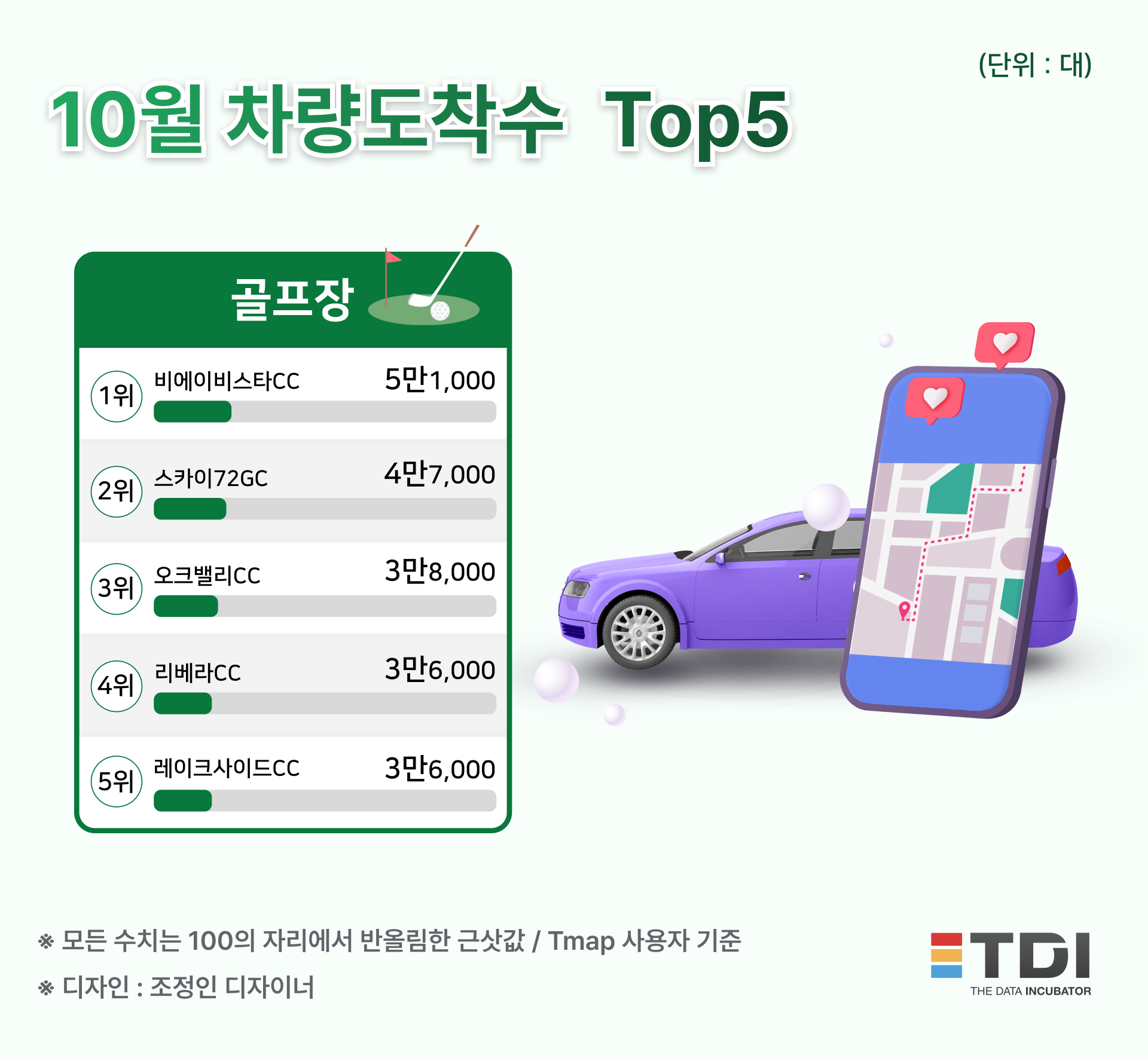 10월 기준 국내 골프장 차량도착수 Top5는 ▲비에이비스타CC ▲스카이72GC ▲오크밸리CC ▲리베라CC ▲레이크사이드CC 순이다.