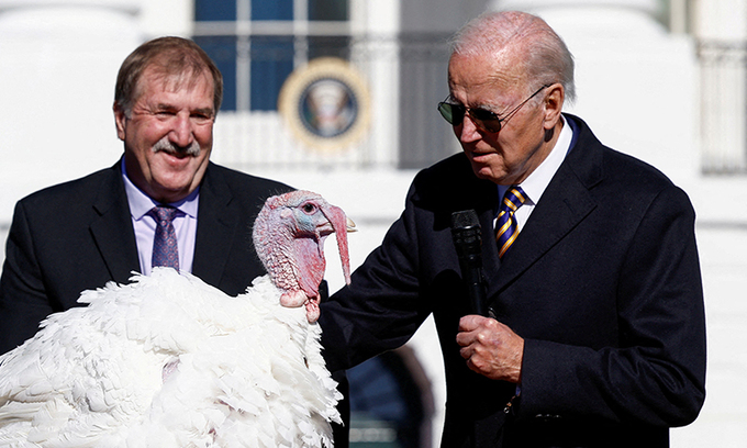조 바이든 미국 대통령이 21일(현지시간) 추수감사절(24일)을 앞두고 워싱턴 백악관 사우스론에서 자신이 가장 좋아하는 아이스크림 이름을 따 ‘초콜릿’이라고 명명된 칠면조를 사면(赦免)하는 의식을 하고 있다. 1989년부터 백악관 연례 공식행사가 된 칠면조 사면식에서 사면받은 칠면조는 칠면조 요리를 먹는 관습이 있는 추수감사절 때 식탁에 오르지 않고 죽을 때까지 방목된다. 바이든 대통령은 이 자리에서 “투표가 있었고, 개표가 이뤄졌고 검증됐다. 부정투표도 반칙도 없었다”고 초콜릿이 사면받을 자격이 있음을 알리면서 11·8중간선거 사기를 주장한 도널드 트럼프 전 대통령 지지자를 조롱했다.