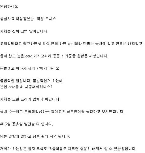 한 취업사이트에는 국내에서 현금을 수금해 무통장 입금을 하는 '불법 일'이라며 믿고 함께할 사람을 구인한다는 글이 게시돼 있기도 하다.