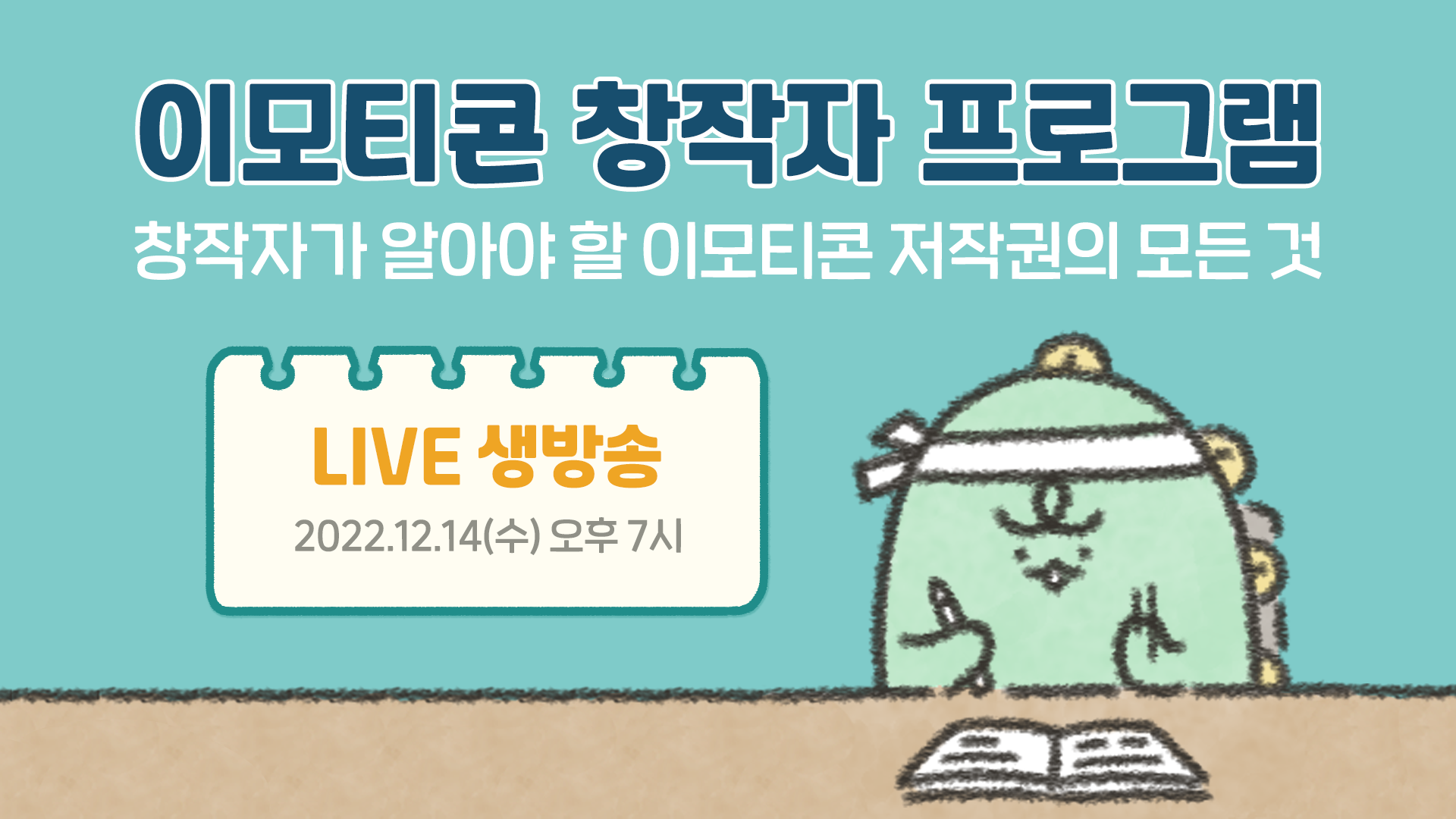 교육은 카카오TV ‘카카오 이모티콘’ 채널을 통해 14일 오후 7시부터 생중계된다. 교육 전 카카오 이모티콘 스튜디오 가입자에게 생중계 방송 링크가 전달될 예정이며, 카카오 이모티콘 스토어 내 위치한 배너를 통해서도 교육에 참여할 수 있다. 카카오는 창작자 참여를 독려하기 위해 온라인 라이브 수강자 전원에게 이모티콘 플러스 1개월 이용권도 지급한다.