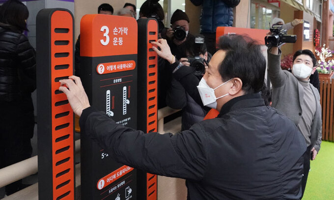 오세훈 서울시장이 13일 송파노인종합복지관을 찾았다. 서울시가 어르신들의 신체·정서 건강을 위해 복지관에 처음으로 꾸민 ‘100세 마당’을 만나보기 위해서다. 100세 마당은 어르신들이 생활권 내에서 쉽게 건강을 관리할 수 있는 장소다. 작은 공간에도 설치할 수 있는 보급형 디자인이 적용됐다.