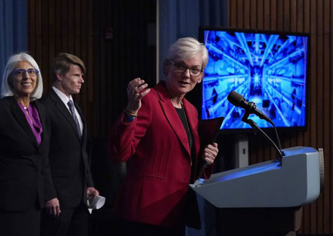 13일(현지시간) AP통신 등에 따르면 제니퍼 그랜홈 에너지부 장관은 이날 워싱턴에서 ‘로런스 리버모어 국립연구소’(LLNL) 관계자들과 함께 핵융합 발전의 상용화 가능성을 높인 연구 결과를 발표했다. 최근 실시한 핵융합 실험에서 투입한 에너지보다 많은 에너지를 만드는 데 성공했다는 내용이다. 2.1메가줄(MJ)의 에너지를 투입해 2.5MJ의 열에너지를 얻는 데 성공한 것인데 약 20%의 에너지 마진을 남겨 0.4MJ의 순 에너지를 전력 생산에 쓸 수 있게 된다.