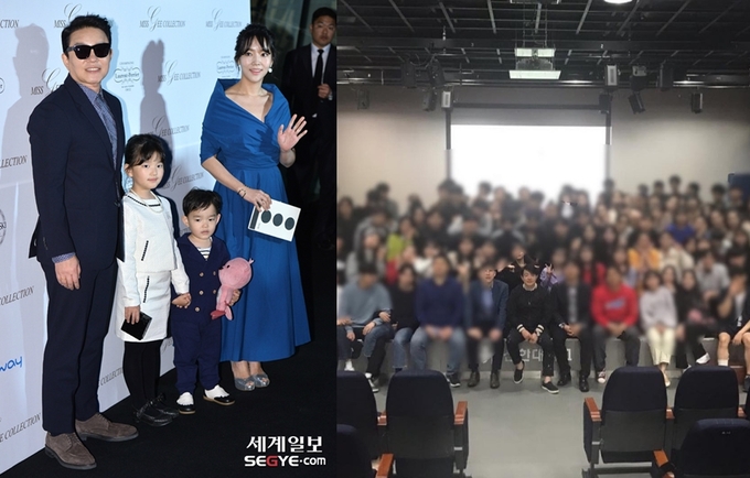 배우 이범수(왼쪽 사진 맨 왼쪽)가 가르치고 있는 학생들을 상대로 ‘갑질’을 했다는 의혹에 휩싸인 가운데 그의 아내 이윤진(〃 〃 왼쪽에서 네번째)이 입장을 밝혔다.