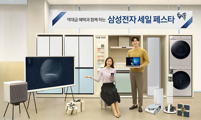 26일 삼성전자 모델이 삼성 디지털프라자 서울 서초본점에서 ‘삼성전자 세일 페스타’를 소개하고 있다. 내년 1월1일부터 2월12일까지 진행하는 ‘삼성전자 세일 페스타’는 가전·모바일 등 대상 모델과 구매 혜택을 확대해 온·오프라인 매장에서 동시 진행한다.