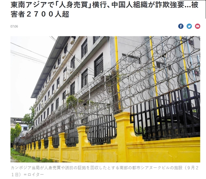 신문은 30일 “동남아시아 각국에서 코로나19 사태로 일자리를 잃은 젊은이들이 중국인 사기조직에 인신매매를 당해 범죄에 가담하거나, 폭행을 당하는 피해가 확산되고 있다”며 ”캄보디아에 난립한 중국자본 카지노가 온상이 되고 있다”고 보도했다.