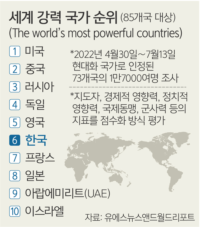 미국의 시사 매체 유에스 뉴스 앤드 월드 리포트는 지난달 31일(현지시간) 발표한 2022년 세계 강력 국가(The world’s most powerful countries) 순위에서 조사 대상 85개국 중 한국을 미국과 중국, 러시아, 독일, 영국에 이어 6위로 평가했다. 한국은 7위 프랑스, 8위 일본보다 앞섰다.