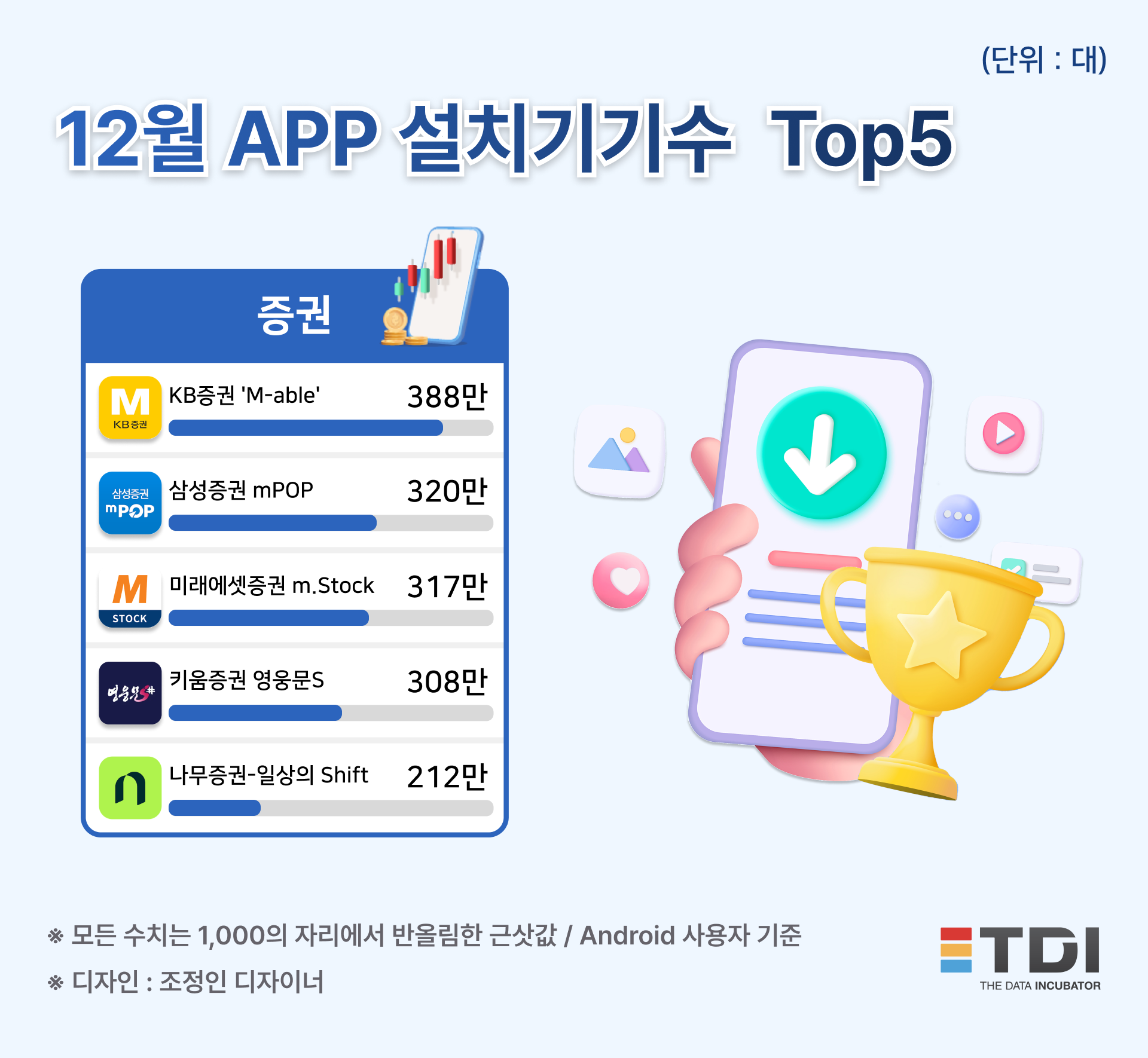 증권 앱의 12월 기준 설치 수 톱5는 ▲KB증권 'M-able'(388만 대) ▲삼성증권 Mpop(320만 대) ▲미래에셋증권 m.Stock(317만 대) ▲키움증권 영웅문S(308만 대) ▲나무증권-일상의 Shift(212만 대) 순이다.