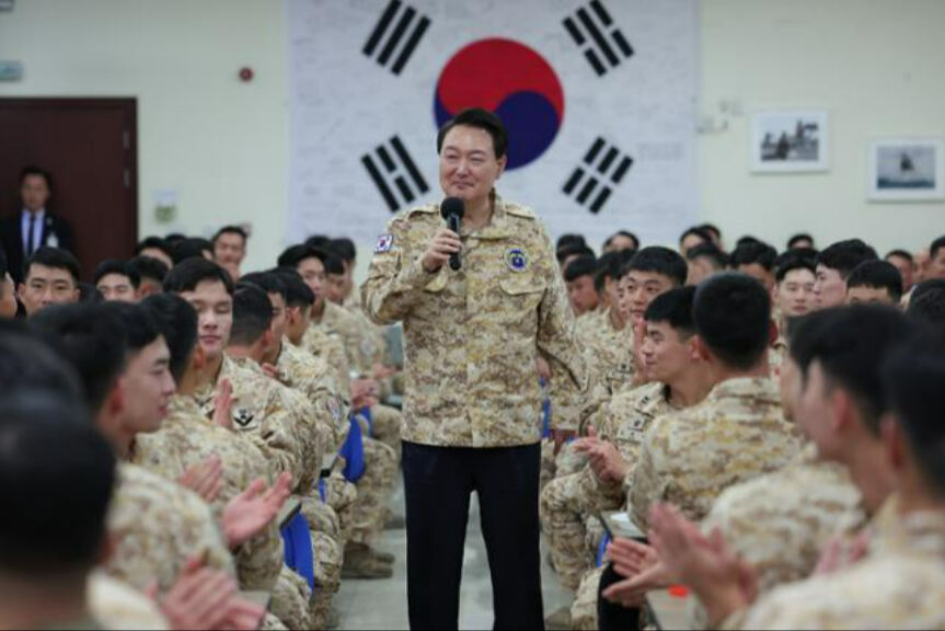 윤석열 대통령이 지난 15일 아랍에미리트(UAE) 아크부대를 찾아 현지에 파병 중인 장병들을 격려하고 있다. 대통령실 제공