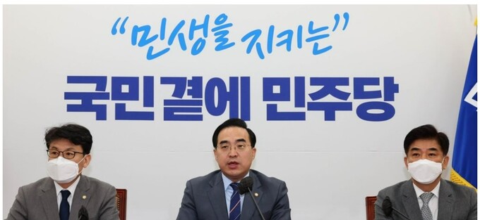 박홍근 더불어민주당 원내대표(사진 가운데)는 26일 국민의힘 나경원 전 의원이 당대표 경선 불출마를 선언한 것과 관련해 "국민의힘 전당대회는 '축제의 장'은 커녕 '숙청의 장'이 됐다"고 말했다.