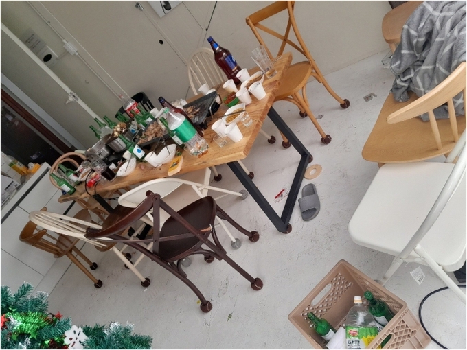 공개한 사진을 보면 파티룸 내부는 각종 쓰레기 등으로 뒤덮여 엉망이 됐다. 식탁에는 손님들이 먹고 남긴 고기와 각종 술, 음료, 음식들이 고스란히 널브러져 있었고, 실내에서 담배를 피운 듯 싱크대에 담배꽁초가 가득했으며, 인조잔디에는 케이크를 엎어놓은 흔적이 있는가 하면 설치된 대형 트리도 부러져 있었다.