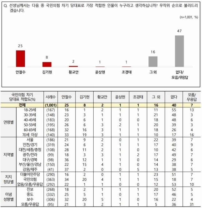 '당대표 적합도'를 질문한 결과 안 후보는 25%로 김 후보(8%)와 오차범위 밖에서 차이를 보였다. 이어 황 후보(2%) 윤 후보(1%), 조 후보(1%) 순이었다.