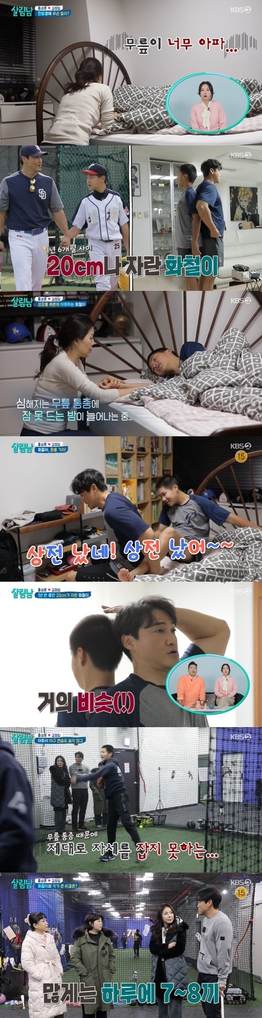 4일 방송된 KBS 2TV 예능프로그램 '살림하는 남자들' 시즌2에선 홍성흔 아들이 급작스럽게 자란 키로 성장통을 겪는 모습이 담겼다. 화철이는 잠을 자다가 무릎 통증으로 소리를 지를 정도로 아파했다.