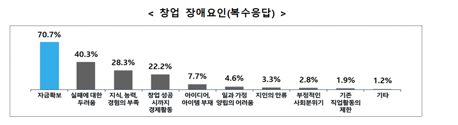 창업 장애요인은 ‘자금 확보’라고 응답한 비율이 70.7%로 가장 높았다. ‘실패에 대한 두려움’(40.3%), ‘창업 지식․능력․경험 부족’(28.3%) 순으로 응답했지만, ‘지인 만류’(3.3%), ‘부정적인 사회 분위기’(2.8%)라고 응답한 비율은 크게 낮은 것으로 나타났다.