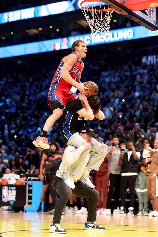 미국프로농구(NBA) 필라델피아 세븐티식서스 소속 신장 188㎝ 무명 가드 맥 맥클렁이 19일 미국 유타주 솔트레이크시티의 비빈트 아레나에서 열린 2022∼2023 NBA 올스타전 전야 덩크 콘테스트에서 두 사람을 뛰어넘어 덩크를 시도하고 있다. NBA에 단 2경기에 나서 8득점이 전부인 맥클렁은 결선에서 트레이 머피 3세(뉴올리언스)를 물리치고 덩크왕에 올랐다.