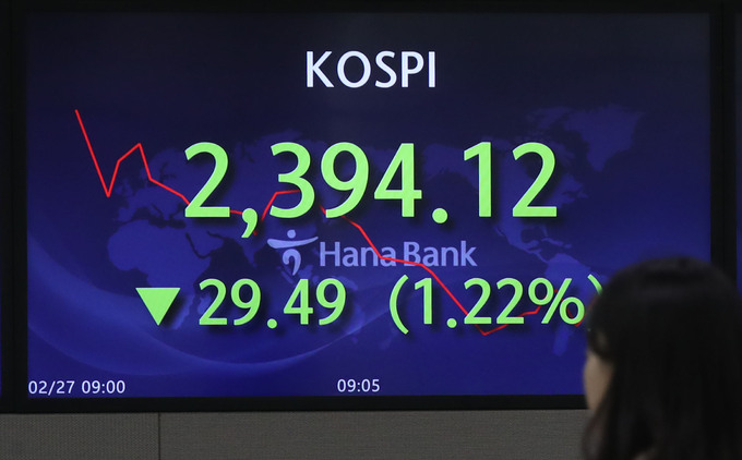 코스피가 약 한달 만에 장중 2400선 아래로 내려앉았다. 미국의 물가 상승으로 연방준비제도(연준·Fed)의 기준금리 인상 전망이 커졌기 때문이다. 1월 증시 상승을 이끌었던 외국인은 이달 들어 투자를 거둬들이고 있다. 증권가도 3월 초 국내증시 약세를 점쳤다.