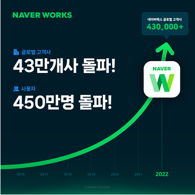 웍스모바일은 지난 2월 일본에서 개최된 비즈니스 컨퍼런스 ‘라인웍스 데이 2023(LINE WORKS DAY 2023, 라인웍스는 네이버웍스의 일본 서비스명, 이하 네이버웍스로 통일)’에서 최근 도입 고객사 및 이용자수를 발표했다. 글로벌 고객사 수는 2020년 10만에서 작년 4분기 43만으로 4배 이상 증가했으며, 이용자수는 450만명을 돌파했다.