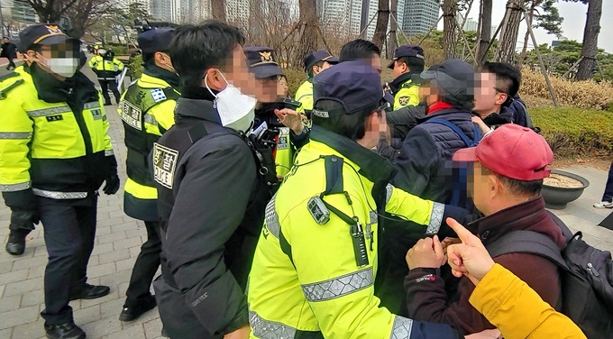 경찰 중재에도 삿대질과 욕설로 대치가 계속되자 경찰은 인근에 준비돼 있던 바리게이트를 설치하기도 했다.