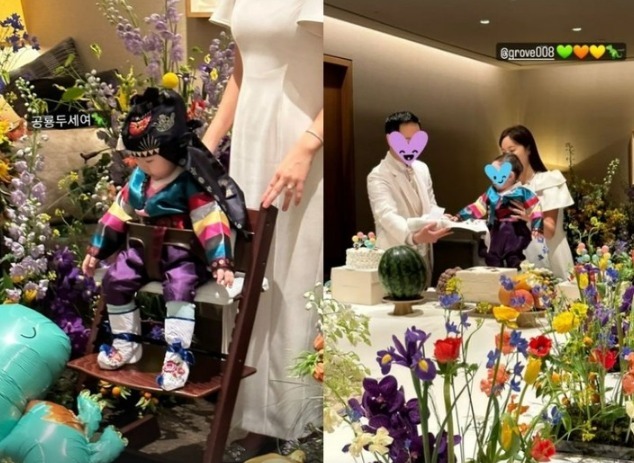주인공인 둘째 아들은 색동저고리 한복을, 황정음과 남편 이영돈은 흰색 원피스와 정장으로 격식을 차렸다. 특히 돌잔치를 위해 꾸며진 다채로운 꽃들이 눈길을 사로잡는다.