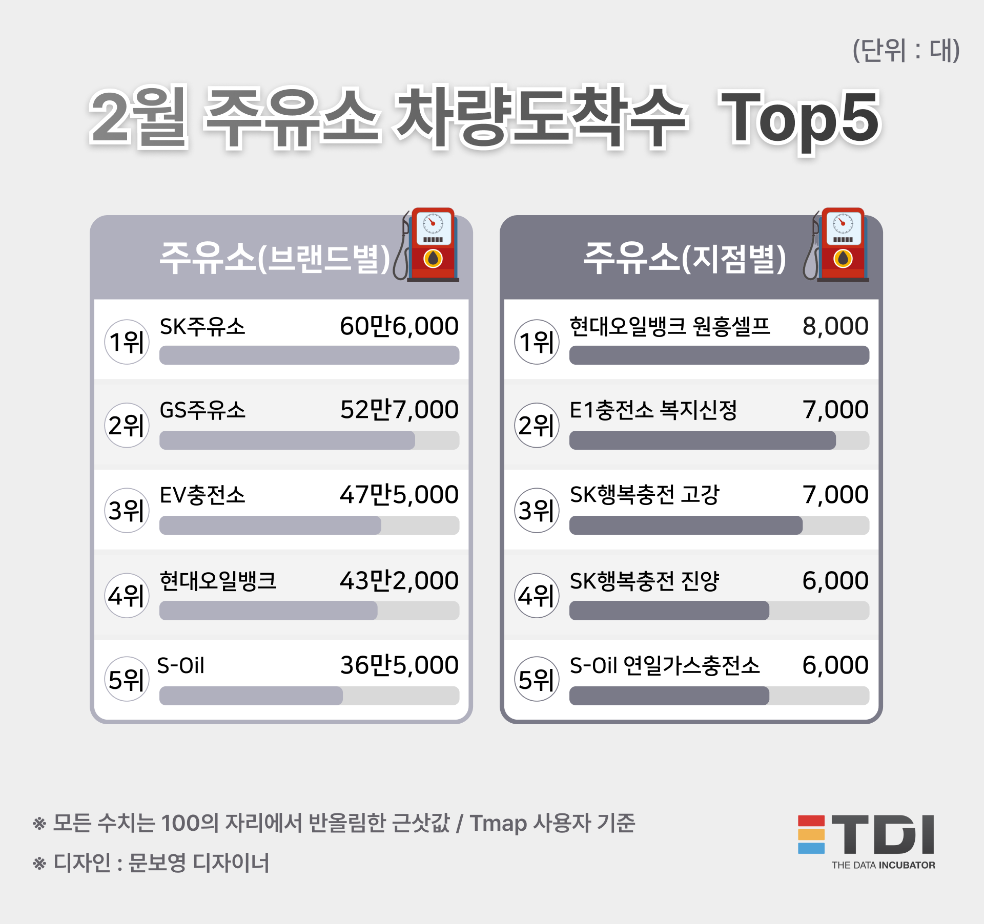 2월 기준 브랜드별 순위는 △SK주유소(60만 6,000대) △GS주유소(52만 7,000대) △EV충전소(47만 5,000대) △현대오일뱅크(43만 2,000대) △S-Oil(36만 5,000대)로 전월의 순위가 유지됐다.