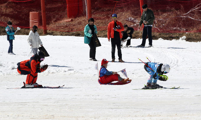 전국이 포근한 봄날씨를 보인 19일 강원 평창군 한 스키장에서 스키어와 스노보더들이 아쉬운 듯 마지막 활강을 만끽하고 있다.