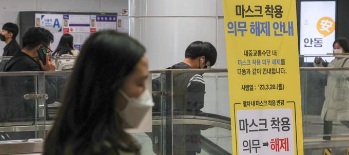 20일부터 버스와 지하철, 택시 등 대중교통 이용 시 마스크 착용 의무가 해제되는 가운데 19일 서울 중구 서울역 개찰구 앞에 마스크 착용 의무 해제 안내판이 놓여 있다.