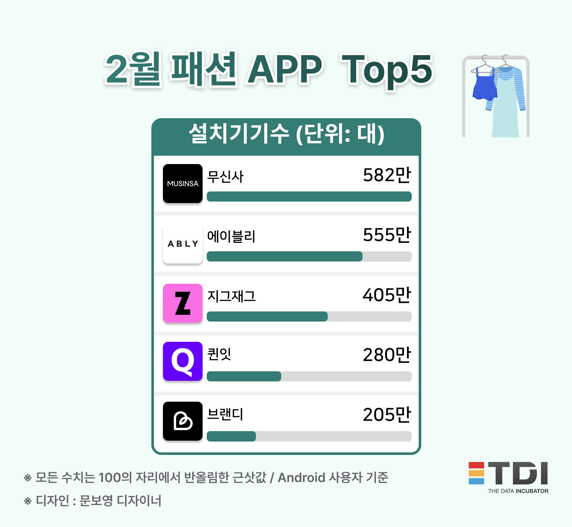 2월 기준 의류 쇼핑몰 앱의 설치 수는 △무신사 582만 대 △에이블리 555만 대 △지그재그 405만 대 △퀸잇 280만 대 △브랜디 205만 대 순이다.